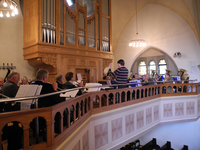 In Oer-Erkenschwick erläuterte Pfarrer Bernd Schäfer die Friedenskirche an der Weidenstraße. Organist Svein Aasen, damals noch im nördlicher gelegenen Aheim tätig war, hatte hier bereits Ende der 80er Jahre ein Konzert gegeben. Danach schloss sich eine Begegnung im Gemeindezentrum an der Johanneskirche an. Hier traf die Gruppe auf die anderen Pfarrer, den Gemeindepädagogen, die Organisten und weitere Mitglieder des Presbyteriums und der Gemeinde. Ein reger Austausch entwickelte sich.