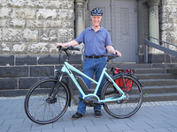 Hans-Jürgen Hörner vom Projektbüro „Der Grüne Hahn“ mit dem „Kirchenrad“ (Modell Trapezrad) am Haus des Kirchenkreises in Recklinghausen.